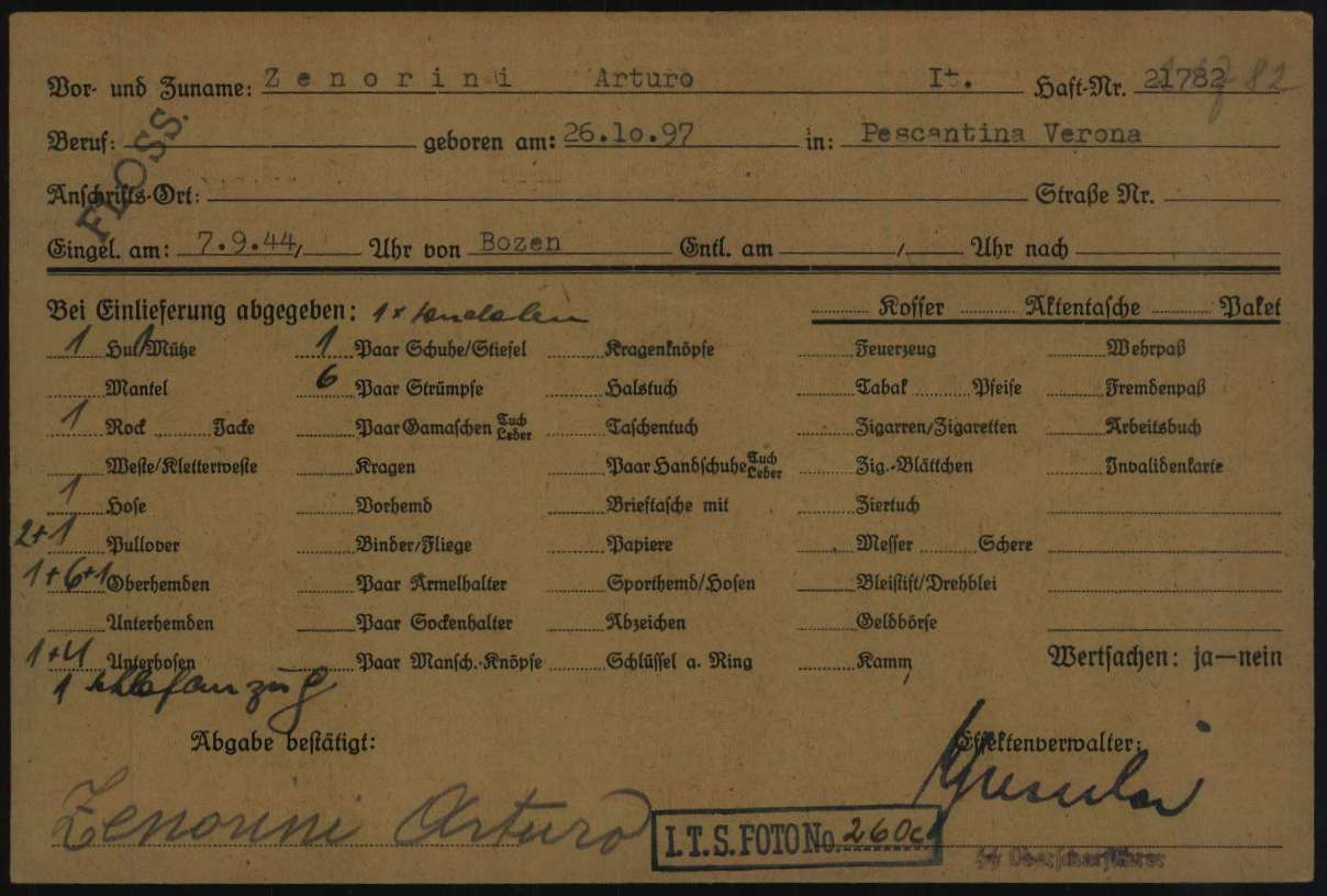 Documenti tratti da The Arolsen Archives online collections – 11051967 / Zenorini Arturo (Flossenbürg) e 10379213 / Zenorini Arturo (Dachau).
