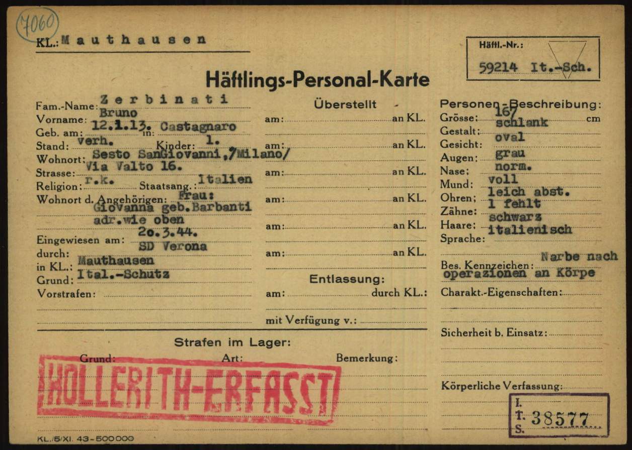 Zerbinati Bruno, nasce a Castagnaro (Verona) il 12 gennaio 1913. Di mestiere tornitore, risiede a Sesto San Giovanni (Milano), è coniugato con Giovanna Barbanti e padre di un figlio. Viene arrestato a Sesto San Giovanni (Milano) il 14 marzo 1944 e detenuto a Milano. Su disposizione del SD di Verona (Sicherheitsdienst – Servizio di Sicurezza delle SS), viene deportato nel Campo di concentramento di Mauthausen sul convoglio partito da Bergamo il 16 marzo 1944 (trasporto n° 34). All’arrivo, il 20 marzo 1944, gli viene assegnato il numero di matricola 59214 e viene classificato come deportato per motivi precauzionali e politici (SCH POL Schutzhäftlinge-Politisch). Il 24 marzo 1944 viene trasferito a Gusen (campo satellite di Mauthausen). Viene poi trasferito al Kommando di Georgenmühle e successivamente viene ricoverato presso l’infermeria di Gusen (Revier). Il 3 aprile 1945 viene nuovamente trasferito al Kommando di Georgenmühle. Viene liberato a Gusen.