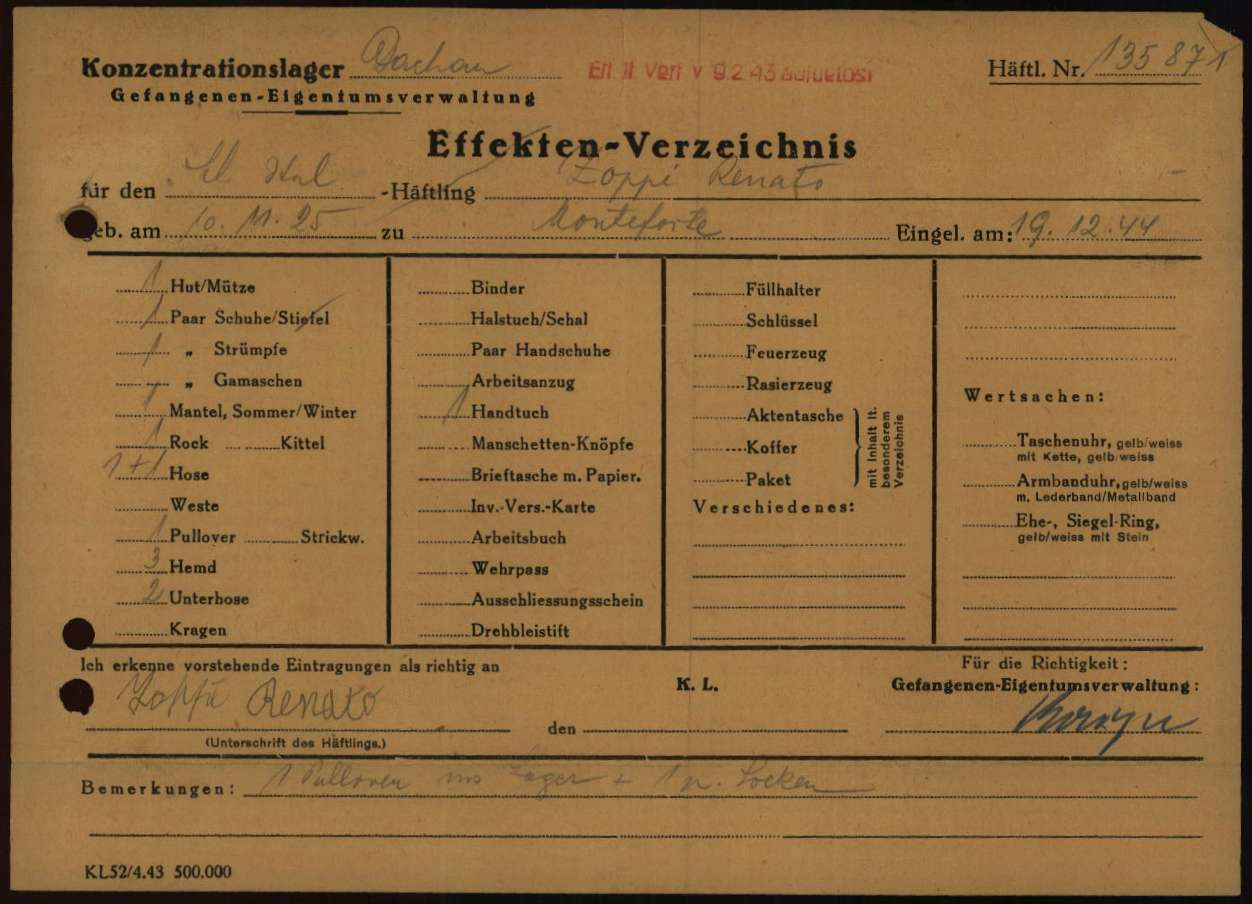 Documenti di registrazione / effetti personali del KL di Dachau in The Arolsen Archives online collections – 10381886 / Zoppi Renato (Dachau).
