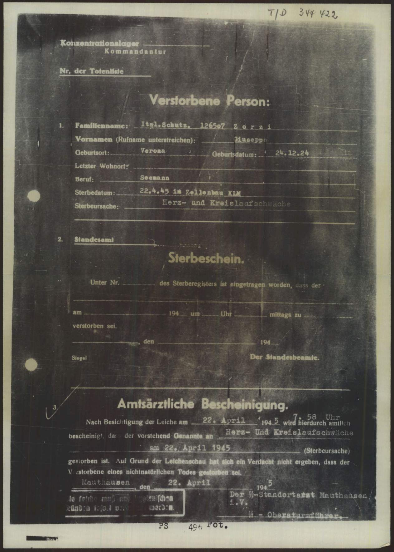Note: nel certificato di morte stilato dalle SS risulta deceduto nel blocco celle. Il mestiere riportato nel certificato di morte è marinaio.