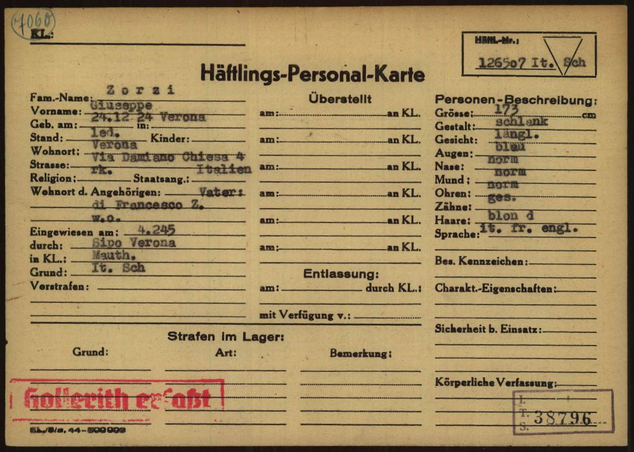 Zorzi Giuseppe, figlio di Francesco e Maria Tommasi, nasce a Verona il 24 dicembre 1924. Studente nautico, risiede a Verona ed è celibe. Viene arrestato a Lughezzano (Verona) e detenuto, prima alle Casermette di Montorio (Verona) e poi presso il Palazzo INA (sede del Comando Generale SS e Polizia di Sicurezza – Befehlshaber der Sicherheitspolizei und des Sicherheitsdienst / B.d.S Italien). Viene poi trasferito nel Campo di concentramento e transito di Bolzano (Polizei – und Durchgangslager Bozen). Su disposizione della Sipo di Verona (Sicherheitspolizei – Polizia di Sicurezza), viene deportato nel Campo di concentramento di Mauthausen il 1° febbraio 1945 (trasporto n° 119). All’arrivo, il 4 febbraio 1945, gli viene assegnato il numero di matricola 126507 e viene classificato come deportato per motivi precauzionali (SCH – Schutzhäftlinge). Il 17 febbraio 1945 viene trasferito a Gusen (campo satellite di Mauthausen). Viene poi ricoverato presso l’infermeria di Gusen (Revier) il 1° marzo 1945. Muore a Mauthausen il 22 aprile 1945.